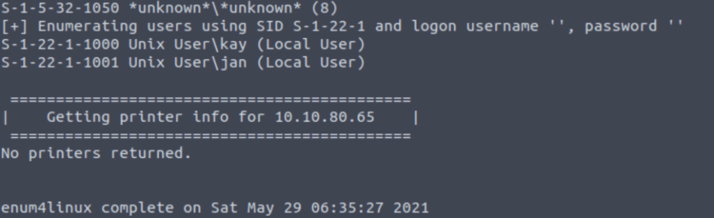 On enumerating the application using “enum4linux” tool we found 2 users on the machine.
