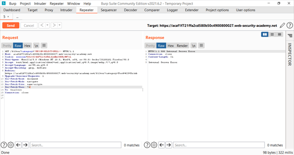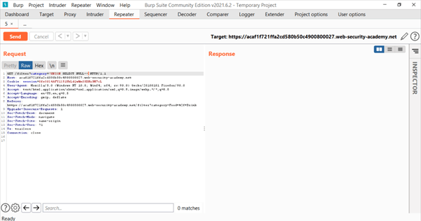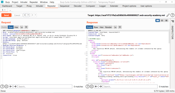 Aim: To solve the lab, determine the number of columns returned by the query by performing an SQL injection UNION attack that returns an additional row containing null values.