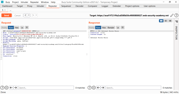 Description: This lab contains an SQL injection vulnerability in the product category filter. The results from the query are returned in the application’s response, so you can use a UNION attack to retrieve data from other tables. The first step of such an attack is to determine the number of columns that are being returned by the query. You will then use this technique in subsequent labs to construct the full attack.