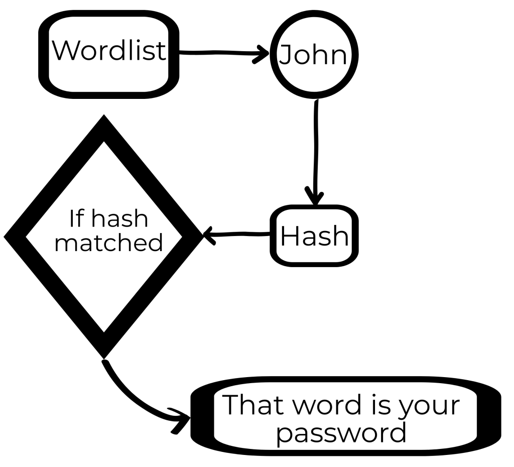 Since, we now know that hashes are irreversible that doesn’t mean we can’t crack the hash. If you had a hashed version of any password and you know that hashing algorithm, you can hash a list of passwords and compare the hashes and can find your original password. This type of attack is called dictionary attack.