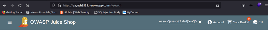 Input the payload in search bar: <script>alert(‘XSS’);</script>