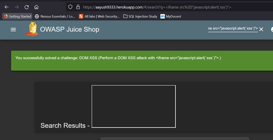 In the search bar of below webpage, we used the payload: <iframe src=”javascript:alert(`xss`)”>