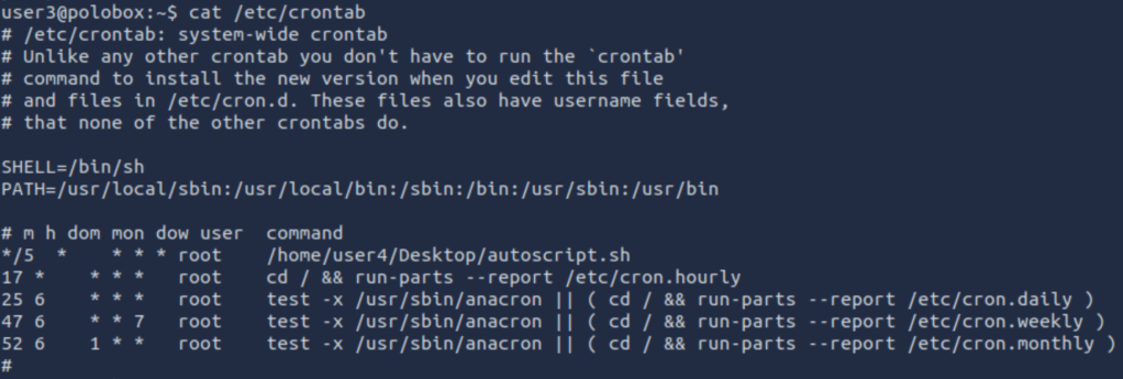 We know from our LinEnum scan, that the file autoscript.sh, on user4’s Desktop is scheduled to run every five minutes.