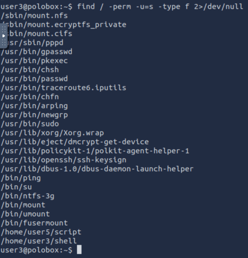 The first step in Linux privilege escalation exploitation is to check for files with the SUID/GUID bit set. These are the files that can be run with the permissions of the file(s) owner/group. In this case, as the super-user.